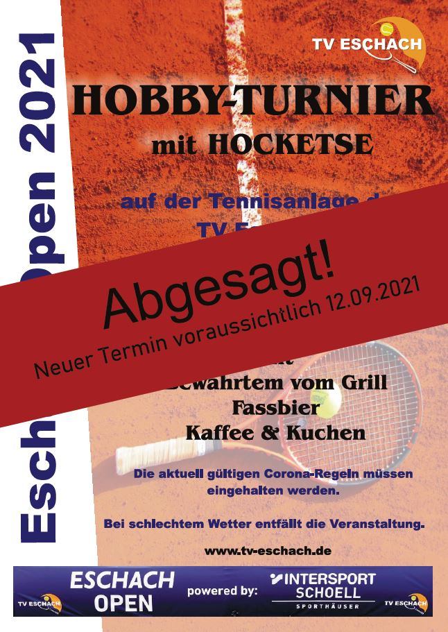 Nachdem die gelockerten Corona-Regeln es nun möglich machen, lässt der TV Eschach nach einem Jahr Pause sein Sommerfest mit Hobby-Turnier wieder stattfinden. Wenn auch in kleinerem Rahmen und zeitlich begrenzt auf einen Tag. So richtet der TV am Sonntag, den 01.08.2021 wieder das Hobby-Turnier aus, in Verbindung mit einer gemütlichen Hocketse. Beginn des Turniers ist um 10.00 Uhr. Mit Bewährtem vom Grill, Fassbier und Kaffee und Kuchen am Nachmittag wird auch für das leibliche Wohl bestens gesorgt sein. Bei schlechtem Wetter entfällt die Veranstaltung. Die geltenden Corona-Regeln müssen eingehalten werden.